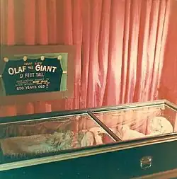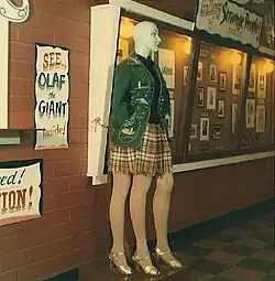 The museum included a collection of funhouse mirrors, mannequins sporting extra legs and arms, a "Death Ray" machine, Sally Rand's dancing slippers, a long row of electronic switches that randomly activated a variety of automatons, a nine-foot-tall "mummified Viking" called Olaf the Giant, and a talking skull wearing a Hitler moustache that loudly spouted gibberish in German. Jones had sped up an actual recording of Hitler, giving his speech a cartoonish quality. The sign in front of the skull read "Hitler is Alive!"