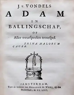 A year earlier, in 1662, Vondel produced what has been called “the greatest Dutch epic”, Joannes de Boetgezant, about the life of John the Baptist.[87] Whereas Vondel's previous attempt, with Constantinade, at writing an epic was abandoned for unknown reasons, Joannes de Boetgezant became the first successful biblical epic of the Dutch Republic.[82] Vondel's model departed from the Virgilian-Tassonian model with regard to its didactic bias, but retained the characteristic motif of the epic since Tasso of the duality between good and evil.[82] Joannes de Boetgezant would become a model for heroic poems in the 18th century.[82] The motif of good versus evil that pervaded Joannes de Boetgezant became a central theme in his final three plays Adam in ballingschap (Adam Exiled) of 1664, and Zungchin and Noach, both published in 1667.[82] Especially the publication of Adam in ballingschap and Noach are significant for the completion of the trilogy that Vondel intended with Lucifer.[88] At the same time, Adam in ballingschap and Noach are also considered to be two of the most "characteristic and admirable highlights of Vondel's imagination."[89] With his last three plays, Vondel tried to harmonize the duality of good and evil with that of the change of state theme, to achieve a synthesis of all of his work from the previous two decades.[90]