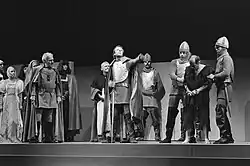 Although Vondel produced thirty-three plays in his life, eight of his plays were translations of mainly classical works.[2] Almost all of his plays are tragedies, with the exception of Leeuwendalers, which is a pastoral work and Het Pascha, which is a tragicomedy.[76][105] Vondel's development as a playwright was largely subject to his reading and translations of works on Ancient Greek theatre and the poetics of Seneca and Aristotle in particular.[100] According to the literary historian W.A.P. Smit, four turning points in the oeuvre of Vondel can be made, which makes it possible to divide his dramatic output in five periods.[106] The first period covers the years between 1610 and 1620; when in 1612 Vondel wrote his first play Het Pascha, and eight years later, in 1620, Hierusalem verwoest.[106][24] This period is characterized by a highly symbolic style of which especially Hierusalem verwoest is very much indebted to Seneca's work.[107] The second period covers the years after 1620 until 1640 and has to be seen against the backdrop of Vondel's acquaintance with P.C. Hooft, Laurens Reael and other members of the Muiderkring on the one hand, and his acquaintance with the works of Virgil, Seneca and Tasso on the other.[106] This period produced the play Amsteldamsche Hecuba (1626), but more significant is his highly dramatic work Palamedes from 1625, in which Vondel used the mythology of the eponymous Greek hero to function as an allegory for the execution of Johan van Oldenbarnevelt, whilst at the same time taking side in the religious-political debate that dominated the Dutch Republic at the time.[108] The second great work of this period is his tragedy set in medieval Holland Gijsbrecht van Aemstel, about the siege and the subsequent sack of Amsterdam.[53] This play, written for the opening of the new Theatre of Van Campen, is probably his most famous and frequently performed play.[24] The last play of this period is the work Maeghden (Maidens), about the legend of Saint Ursula, in which Vondel showed a new affinity with the Ancient Greek drama.[53]