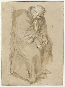 From the publication of Noach onwards, which was completed when he was 80 years old, Vondel no longer wrote long poems.[91] Because of his old age, his daughter Anna had moved in with her father to take care of him.[92] As a result of an outbreak of the plague in Amsterdam in 1664 (which cost the lives of 24000 people; 10% of the population), his grandson Adriaan died in 1664 and not much later also his granddaughter Maria.[93] Although Vondel's family lived relatively prosperous, partly because of an inheritance they received from one of the widows of Joost jr., disaster struck the family once more when also Vondel's grandson Willem died in 1670 and not much later his daughter Anna in 1675.[94] As a result, Vondel's only remaining grandchild Justus and his wife moved in with him.[95] In the meantime the Third Anglo-Dutch War broke out, along with the Rampjaar in 1672; events that were particularly devastating for Vondel, because Johan de Witt, who was greatly admired by him for defending the policy of toleration, was murdered by an angry mob. About this tragedy Vondel wrote a short poem.[95] At the end of his life Vondel was occasionally visited by friends, such as his first biographer Gerard Brandt and the painter Philips Koninck, who made several drawings and paintings of Vondel.[96] On 5 February 1679 Vondel died at the age of 91.[97]