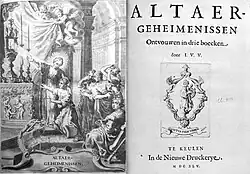 Somewhere around 1641 one of the most significant events in Vondel's life occurred, namely his conversion to Catholicism.[57] His conversion to Catholicism didn't came entirely out of nowhere, since Vondel already showed sympathy for Catholicism by using Catholic imagery in plays such as Gijsbrecht van Aemstel and Maidens.[57] Exactly when his conversion took place is not entirely clear, but most scholars agree that it must have been around 1641 (although Brandt and Jacob van Lennep date it between 1639 and 1640).[58][59] Because Vondel never left a justification as to why he converted to Catholicism, it remains a guess what his motivations might have been.[60] What helped was that his daughter Anna already converted to the Catholic faith and his friend Hugo Grotius earlier made pleas for a reconciliation between Christians and a return to the church of the first centuries AD.[61] According to Smits-Veldt, Vondel apparently favored the idea of "a united community of believers for whom ecclesiastical authority was binding" over the internal struggles in for instance his own Mennonite community, where only the Bible can be a source of faith.[62] His conversion in any case resulted in two important works that were directly related to his new faith. The first of which was the tragedy of 1646 Maria Stuart (Mary Stuart), in which the Catholic queen Mary was portrayed as an innocent victim of the bloodthirsty Elizabeth I.[62] As with many of his previous plays, also this play had a strong political dimension and was very controversial. Firstly, it angered the Calvinists, who were abhorred by the glorification of Catholicism, and secondly, it offended the people who did not wish to see their one-time ally in the war against Spain, Elizabeth I, to be portrayed as a rebel.[62] The second work of this period that dealt with his Catholic convictions is a long epic-didactic poem called Altaergeheimenissen (Secrets of the Altar, 1645), in which Vondel provides a plea in favor of the Sacraments of the Catholic Church.[63] Although Vondel also defended his new faith in De heerlijkheid der kerke (On the Church), Altaergeheimenissen is one of the few instances in his oeuvre where he deals explicitly with his Catholic faith.[64] In the centuries that followed Altaergeheimenissen eventually went on to be regarded as one of Vondel's most beautiful and important works.[65]