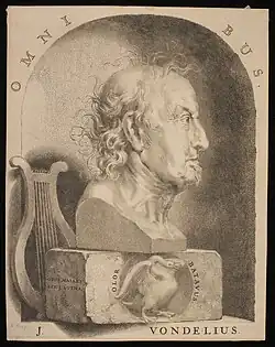 Although as a playwright, Vondel worked in primarily one specific genre; the tragedy, as a poet he covered almost every poetic genre: odes, elegies, satires, occasional poetry, paeans, obituary poetry, hymns and sonnets.[4] Vondel's work as a poet has to be seen in the context of the tradition of the Chamber of rhetoric, which were literary societies that originated in the Southern Netherlands in the 15th century, but spread to the Northern provinces, where members studied and composed poetry together especially for specific occasions.[112] From 1606, if not earlier, Vondel was a member of ’t Wit Lavendel’ (The White Lavender).[20] Many of his poems were written for specific occasions and are therefore occasional poetry, but at the same time, the occasional poems were sometimes written as e.g. hymns, or sometimes as e.g. funerary poetry; and are therefore overlapping in terms of genre.[113] The characteristics that apply to Vondel's plays, can to a certain extent also be applied to Vondel's poetry. Like many of his plays, Vondel used his poems to comment on political, religious and cultural matters.[114] And just like in his plays, Vondel aims to elevate the reader of his poetry and at the same time to propagate a certain point of view (often of a moralistic and didactic nature) on an abstract level of truths and values.[115] The model Vondel used for his poems is derived from classical literature. But whereas his plays are modelled on the Ancient Greek playwrights and the poetics of Aristotle, his poetry is more indebted to Virgil, Ovid and especially Horace (i.e. his poetry, but also his theoretical work Ars Poetica).[116] Apart from the influences of Latin literature, the works of the French poet Guillaume de Salluste Du Bartas were also an important influence.[74]