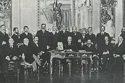 Though no longer holding high party jobs, in the capital Cortina was more exposed to big politics. He mixed with Madrid-resident Traditionalist leaders and royal figures, e.g. entertaining princess Beatriz in 1918.[126] His call to create militia protecting religious establishments in wake of social unrest of late 1918[127] and early 1919[128] briefly gained him attention in the Cortes. When the conflict between de Mella and Don Jaime exploded into a full-scale confrontation in 1919, Cortina decided to side with the rebels.[129] However, he was scarcely involved either in internal struggle or later in buildup of the new secessionist organization;[130] in the early 1920s he rather withdrew from politics, attending only vaguely related gatherings.[131] This was the case also following the Primo de Rivera coup of 1923; somewhat sympathetic to Somatén[132] he stayed clear of politics and limited himself to posthumous homages to de Mella.[133] Until 1927 Cortina was listed on various assignments within Ministerio de Fomento.[134]