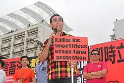 José Pereira Coutinho protesting in the streets of Macau in February 2014 against the rejection by the Legislative Assembly of a bill that gives animals basic rights