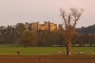 Custody of Ludlow was contested not only by Stephen but also by Gilbert de Lacy, whose efforts to wrest the castle from Josce are the background to the medieval romance Fouke le Fitz Waryn;[14] the extant prose version dates from the 14th century, but it was originally a 13th-century poem, now lost.[15] Gilbert claimed the castle through his familial link with Sybil, fitzJohn's widow, who was a member of the de Lacy family.[16] Others trying to take Ludlow were Hugh de Mortimer and Gilbert de Lacy.[17] According to the Chronicle of Wigmore Abbey, some time after September 1148[d] Mortimer and Josce became embroiled in a private war, during which Josce seized Mortimer while the latter was travelling. Josce imprisoned his captive in Ludlow and demanded a ransom of 3,000 silver marks,[18] as well as, according to the Chronicle, Mortimer's "plate, his horses, and his birds".[19][e] Presumably, Mortimer met the ransom, as he is later known to have been a free man.[18]