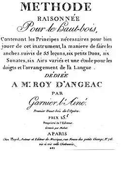 From 1792, he taught oboe at the National Guard where he became friends with the violinist Rodolphe Kreutzer, who dedicated his oboe concerto to Garnier and with whom Garnier gave the concerto's first performance. Garnier joined the National Conservatory of Music (founded by the Convention) in 1795, where he was one of five professors of oboe (along with Bernard Delcambre, Gebauer, François Félix-Miolan and François Sallantin.[2] Garnier was dominant at the Conservatoire; he was "the savior of the French school of oboe during the Revolution."[3]