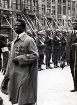 The Congolese Volunteers' Corps for the Belgian Army was founded on 5 August 1914. Several Congolese volunteers enrolled, including Paul Panda Farnana and Adipanga. Under the lead of Louis-Napoléon Chaltin, Adipanga fought during the Siege of Namur, but was captured by the German Army, together with Farnana and Albert Kudjabo.[3] Adipanga managed to escape and went on to fight with the First Carabineers' Regiment until 15 August 1915. He participated in the Battle of the Yser at Tervate, Stuivekenskerke, in October 1914.[4] Then, he fought for the Second Regiment until 9 August 1918. Wounded in action, he received eight Chevrons de front for his service during the war.[5]