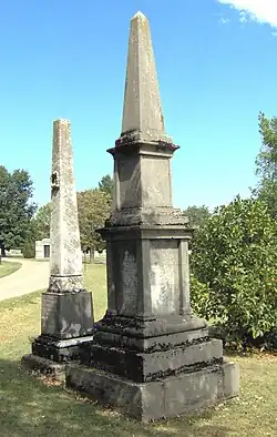 At the expiration of his term as governor, Desha retired from public life to his farm in Harrison County.[3] During the final years of his life, Desha and his wife Margaret moved to Georgetown, Kentucky, where one of his sons, a physician, lived. Desha died at his home in Georgetown, Kentucky, on October 11, 1842, and was buried on the grounds.[12] The state erected a monument over his grave.[12] In 1880, both Desha's body and the monument were moved to Georgetown Cemetery.[12]