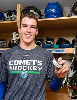 He scored a career-high 11 goals with 11 assists and was -3 with 22 penalty minutes. After four seasons with the Wisconsin Badgers, he signed a contract with the Canucks. He was sent down to the Utica Comets and posted his first professional career goal against the Lehigh Valley Phantoms after a gruesome fight with Samuel Morin.[5] He participated in the Canucks 2016–17 preseason games, posting a goal, but was eventually sent down to the Comets.[6]