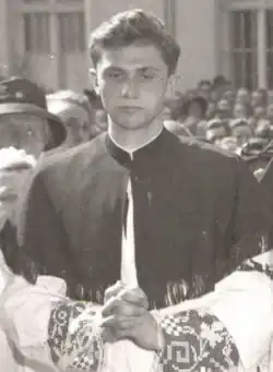 According to his cousin, Erika Kopper, Ratzinger had no desire from childhood to be anything other than a priest. At the age of 15, she says, he announced that he was going to be a bishop, whereupon she playfully remarked: "And why not Pope?".[5] An even earlier incident occurred in 1932, when Michael Cardinal von Faulhaber, Archbishop of Munich, visited the small town in which the Ratzinger family lived, arriving in a black limousine. The future pope, then five years old, was part of a group of children who presented the cardinal with flowers, and later that day Ratzinger announced he wanted to be a cardinal, too. "It wasn't so much the car, since we weren't technically minded", Georg Ratzinger told a reporter from The New York Times. "It was the way the cardinal looked, his bearing, and the knickerbockers he was wearing that made such an impression on him."[6]