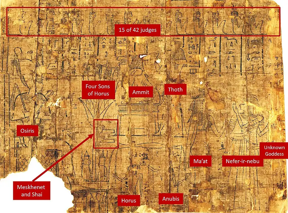 | "Nefer-ir-nebu Book of the Dead" Judgement Scene | Funerary papyrus scroll fragment made for Nefer-ir-nebu (also Neferirtnub, Noufianoub) showing a vignette with the deceased standing before Osiris, waiting to have her heart weighed on a balance against a feather to determine if she is worthy of further existence or having her soul devoured by Ammit | No known description given by Joseph Smith. | III a,b | circa 300–100 BC |