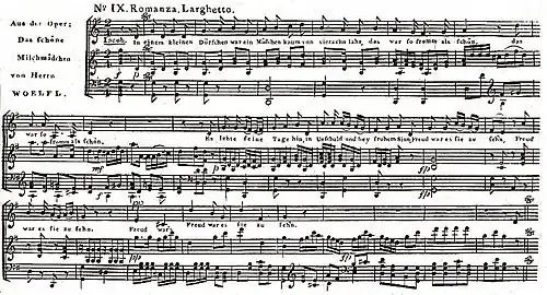 Although he dedicated his 1798 sonatas Op. 6 to Beethoven, the two were rivals. Beethoven bested Woelfl in a piano 'duel' at the house of Baron Raimund Wetzlar in 1799, after which Woelfl's local popularity waned. However, Beethoven deeply admired his music following the duel.[4] After spending 1801 to 1805 in Paris, Woelfl moved to London, where his first concert performance was on 27 May 1805. On 12 March 1806 he published Six English Songs which he dedicated to the English soprano Jane Bianchi.[5]