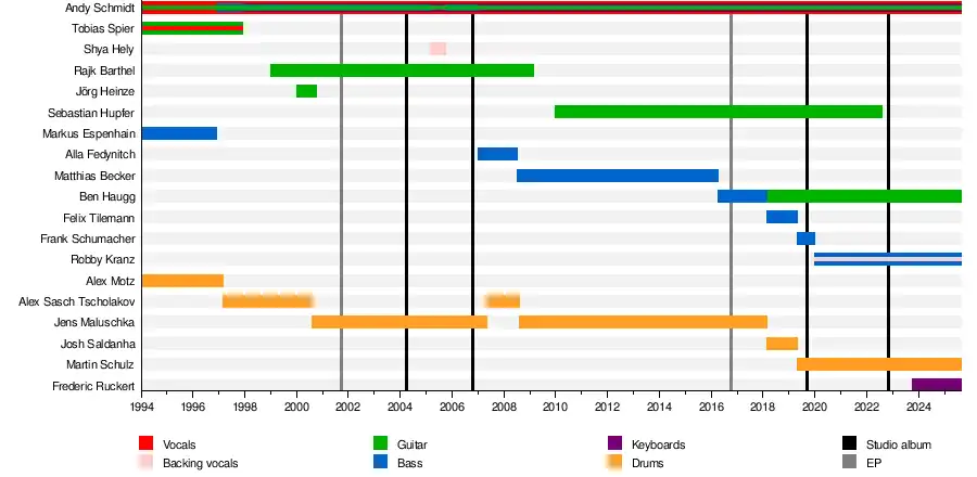 On December 8, 2009, Andy Schmidt announced that the band had been separated from guitarist Rajk Barthel.[5] At the end of 2010, Sebastian Hupfer joined the band as the new guitar player. In 2011 some shows were played. This was followed by a hiatus, which Andy Schmidt explained with private challenges of the individual band members.[6]