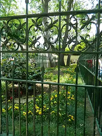 The tomb area is planted with miniature begonias and surrounded by mature trees. At one end of the grave are two cylindrical stones reminiscent of small millstones. In the centre of one of them are a quadrangular opening and a very noticeable fissure. The grave is surrounded by a stone wall containing two doors and several windows. Visitors enter through one of the doors, pass around the grave in a circle and exit through the second one.