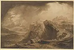 Gibeon was apparently a relatively powerful city-state, 'like one of the royal cities' (verse 2), although it did not have a king (none is mentioned in Joshua 9), so its submission to the Israelites without war shocked the region (verses 1–15) and the neighboring states declared war to Gibeon for the perceived betrayal.[19] Having an alliance with Israel, the Gibeonites can requested help from the Israelites (verse 6).[20] This opportunity enabled Joshua at the same time to fight for control of the whole southern region of Canaan.[20] Jerusalem occupies an important location on the central ridge, between south and north mountains, and its king, Adoni-zedek, established an alliance with four other kings from across the southern highlands (cf 12:10–13; later would become the territory of Judah).[20] The battle report against the southern alliance emphasizes the hand of God in the victory, as the hailstones from heaven were more devastating than the action of Israelite forces, and the staying of the sun and moon (meaning that 'the day was lengthened') demonstrated that YHWH, not Joshua, had the full control of even the heavenly bodies in the defeat of the southern kings.[20]