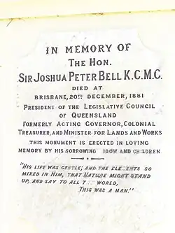 Joshua Peter Bell died suddenly on 20 December 1881 and was buried at Toowong Cemetery.[1][4] A memorial to him was also erected at Jimbour Homestead.