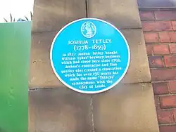 Aged 29, Tetley married Hannah Carbutt on 12 March 1808 at Sheffield Parish Church. Carbutt was from an affluent family which included former Mayors of York and Leeds.[9] They settled in a house on Park Square in Leeds. In 1822, aged 44, Tetley leased William Sykes' Brewery in Salem Place, Hunslet.[5] Unusually for the time, Tetley head hunted staff, looking only for the most skilled brewers and maltsters from as far away as Manchester. Once the brewery was established it became the second largest in Leeds and had an estimated value of £22, while Robert Arthington's brewery held an estimated value of £100.[10] Following the passing of the Beerhouse Act 1830, Tetley's business grew and his recently acquired ale houses opened between 4 am and 10 pm. The temperance movement approved beer as a temperate alternative to spirits, which led to the growth of many small breweries. When Tetley's father William Tetley died in 1834, Joshua received (according to William's 1820 will) £450 worth of his assets, much of which was invested in the Tetley business.[11]