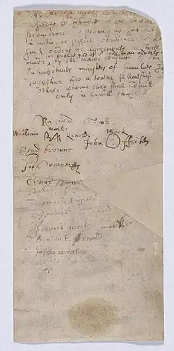 - ^ Excerpt from Winthrop journal, December 1638: "...For whereas, at their first coming thither, Mr. Williams and the rest did make an order, that no man should be molested for his conscience, now men's wives, and children, and servants, claimed liberty hereby to go to all religious meetings, though never so often, or though private, upon the week days; and because one Verin refused to let his wife go to Mr. Williams so oft as she was called for, they required to have him censured. But there stood up one [William] Arnold, a witty man of their own company, and withstood it, telling them, that when he consented to that order, he never intended it should extend to the breach of any ordinance of God, such as the subjection of wives to their husbands, &c. and gave divers solid reasons against it. Then one [Surgeon John] Greene...replied, that if they should restrain their wives, &c. all the women in the country would cry out of them, &c. Arnold answered him thus: Did you pretend to leave Massachusetts because you would not offend God to please men, and would you now break an ordinance and commandment of God, to please women? Some were of opinion, that if Verin would not suffer his wife to have her liberty, the church should dispose her to some other man who would use her better. Arnold told them, it was not the woman's desire, to go so oft from home, but only Mr. Williams' and others. In conclusion, when they would have censured Verin, Arnold told them, that it was against their own order, for Verin did that he did out of conscience; and their order was, that no man should be censured for his conscience."[18]