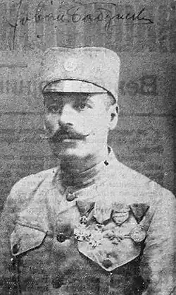 Following the outbreak of World War I, Babunski formed the Sava Chetnik detachment, which was placed under the command of Major Vojislav Tankosić.[10] The unit suffered its first casualties when Austro-Hungarian river monitors shelled Belgrade on the night of 28 July 1914, killing a 16-year-old Chetnik volunteer named Dušan Đonović, the first victim of the war. Shortly afterwards, Babunski's Chetniks destroyed a railway bridge on the Sava to prevent the Austro-Hungarians from crossing.[11] Babunski and his men returned to Macedonia in 1915 and fought Bulgarian guerrillas.[12] At the beginning of 1915 Babunski became the first Commander of the Vardar Detachment, a tactical-operational unit belonging to the Serbian Army Vardar Division, but allowed to operate independently. The formation of 1,640 members, later increased to 5,898,[13] was led by Serb officers and non-commissioned officers and composed of Macedonians soldiers.[14] The unit was located in the eastern parts of the Vardar part of Macedonia, in the area of Kratovo, Ovche Pole, Kočani,[15] assigned to secure the border against Bulgarian's incursions, often clashing with IMRO chetas.[13]