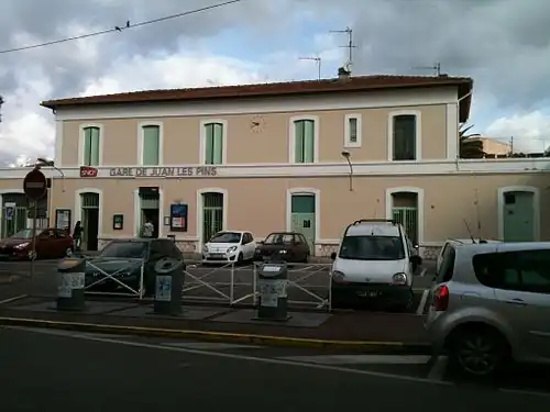 Juan-les-Pins station (French: Gare de Juan-les-Pins) is a railway station serving the town of Juan-les-Pins, part of the commune of Antibes, in the Alpes-Maritimes department, southeastern France. It is situated on the Marseille–Ventimiglia railway, between Cannes and Nice. Trains pass through this station between 5am and 1am daily. The station is served by regional trains (TER Provence-Alpes-Côte d'Azur) to Cannes, Grasse, Antibes and Nice.[1][2]