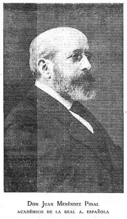 Juan Menéndez Pidal (1858, in Madrid – 1915) was a Spanish archivist, jurisconsult, historian, and poet, brother of Luis and Ramón Menéndez Pidal. He was long a director of the Archivo Histórico Nacional at Madrid, and a director of the Revista de Archivos, Bibliotecas, y Museos.
