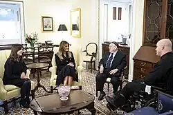 U.S. President Donald Trump invited Samet to be one of his personal guests at the 2019 State of the Union Address, which Trump gave on February 5, 2019.[14] Samet visited the White House and met President Trump, First Lady Melania Trump, First Daughter Ivanka Trump, and Senior Advisor to the President Jared Kushner.[12] After Trump introduced Samet in the Address and noted that it was Samet's 81st birthday, the crowd applauded, gave him a standing ovation, and sang "Happy Birthday" to him.[15][16] Samet smiled, blew a kiss, waved down to Trump, stood up, bowed his head, and shouted "thank you". Trump jokingly conducted with his hands and said, "They wouldn't do that for me".[15][16][17] He was not wearing his kippah at the Address because a government employee had told him "nobody wears a hat here" upon entering the House Chamber.[18] Samet later said that he admired Trump and called him a "working man".[12] A Republican, Samet supported Trump, saying about him: "I like him very much. He is strongly pro-Israel. That a man would go outright for Israel and declare for Jerusalem to be the capital of Israel ... that was something new."[4][19] He was, however, not politically active, as opposed to his Democratic family members.[20]