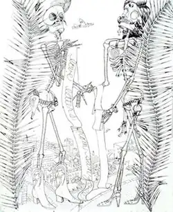 In the early 1970s, Linhares created narrative drawings and assemblages that appropriated commonplace or "craft" materials and feminine imagery (flowers, eggs, swan feathers, domestic scenes), pushing back against passé notions of "women's art."[6][35][36] Her "At Home in San Jose" drawing series was noted for startling, often humorous, imagery developed through introspection, which juxtaposed skeletons, devils and women in scenes of cozy domesticity or macabre religio-erotic fantasies.[37][31][9] San Francisco critic Alfred Frankenstein recognized them most for their "meticulous draftsmanship" and elegant design sense, calling her a successor to renowned Mexican printmaker José Guadalupe Posada";[38][39] others compared their spiky, linearity and ghostly imagery to the work of Aubrey Beardsley.[4]