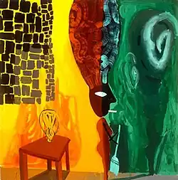 Linhares's ability to reconcile these tensions derives from her absorption of a dizzying array of traditions—from Symbolism to Abstract Expressionism to California Funk—whose strategies she turns to her own idiosyncratic aims.[31][22][4][9] Adams called her "a vanguardist in the reassessment of Mexican influence and spirit in modern art."[4] Pagel wrote that her work revisits German Expressionism, "recuperating its original animal innocence (and playful verve)," sans the recent layers of irony, aggression and bombast added by various Neo-Expressionisms.[1] Linhares cites expressionists Max Beckmann, James Ensor and Edvard Munch, artists negotiating "the line between figuration and abstraction" such as David Park and Bob Thompson, and surrealists Remedios Varo and Toyen, who depicted powerful, sexual women, as key inspirations.[12][32] In light of the complex welter of influences, critics consistently note Linhares's "evocative magic act"[33] of pulling off work that appears deceptively nonchalant,[34] breezy,[5] and improvisational[19] in its "easy virtuosity."[21]