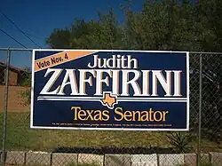 In 1994, she won more than two thirds of the ballots cast in the general election against the Republican candidate, Fernando G. Cantu Jr. (1944–2016), 71,029 (68.5 percent to 32,624 (31.5%).[7] In the Democratic primary held on March 4, 2008, Zaffirini was to have faced San Antonio attorney Rene Barrientos but Barrientos withdrew from the race. His name, however, remained on the ballot, and he did some advertising. Zaffirini won the nomination, 108,572 votes (78.6 percent); Barrientos, 23,262 (21.4 percent).[8][9][10]