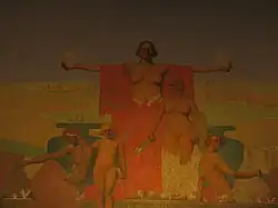 In 1912, when the architect Henry Bacon was competing with John Russell Pope to win the commission for the Lincoln Memorial in Washington D.C., he hired Guérin to create renderings of alternative designs. The paintings, still in the National Archives, were likely influential in Bacon's triumph. After he received the commission, Bacon retained Guerin to paint two large murals, Reunion and Emancipation, that decorate the cella of the memorial above the Gettysburg and Second Inaugural Addresses. They were recently cleaned, revealing a subtle color palette that complements Daniel Chester French’s Seated Lincoln statue.[5] In 1916 he was elected into the National Academy of Design as an Associate member and became a full Academician in 1931.