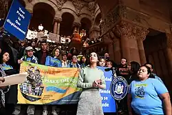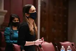 Julia Salazar (born December 30, 1990) is an American politician and activist. She is the New York State Senator for the 18th district, which covers much of northern Brooklyn, centered on Bushwick. She won the seat as a first-time candidate after unseating incumbent Senator Martin Malave Dilan in the Democratic Party primary in 2018.[1] She attracted national media attention for her support for sex workers' rights and other views. A member of the Democratic Socialists of America, she became the first member of the organization to serve in New York's state legislature.[2][3]