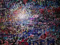 Many people write their names and the names of loved ones on the walls of the entrance, known as Juliet's wall. In 2019,[6] after a restoration and cleaning of the building, it was intended that further writing should be on replaceable panels[7] or white sheets[8] placed outside the wall.