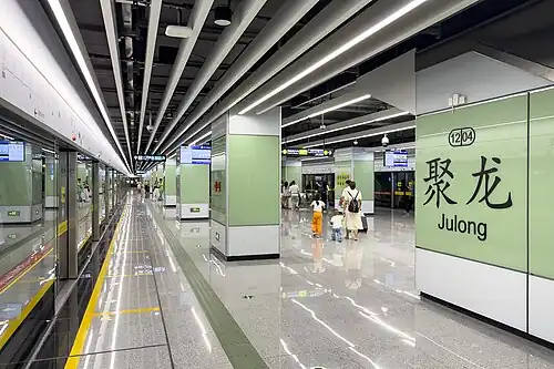 Julong Station (simplified Chinese: 聚龙站; traditional Chinese: 聚龍站; pinyin: Jùlóng Zhàn; Cantonese Yale: Jèuhlùhng Jaahm) is an interchange station between Line 8 and Line 12 of the Guangzhou Metro. It is located under the intersection of Xicha Road, Shicha Road and Dekang Road in Guangzhou's Baiyun District. The Line 8 station started operation on 26 November 2020. The Line 12 station started operation on 29 June 2025, becoming an interchange station.[1]