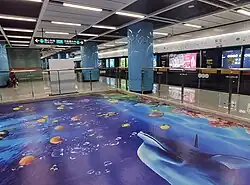 The Line 8 section uses light blue as the main color. Like the stations in the northern extension of Line 8, it is decorated with glass panels. The Line 12 section is decorated with the uniform white of the standard station of Line 12 with a turquoise glass curtain wall.