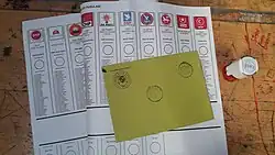 The Independent Turkey Party, led by Haydar Baş, campaigned on its policy of raising the minimum wage to ₺5,000 and claimed continuously that private polling results showed that the BTP was trailing above the 10% threshold.[113] The Anatolia Party (ANAPAR), led by Emine Ülker Tarhan, claimed that they would surpass the 10% threshold and criticised the opposition parties for their ineffectiveness.[114][115] Tarhan also promised to give young citizens 5 GB of free internet per month.[116] The Centre Party (MEP), led by Abdurrahim Karslı, campaigned on the need for a fundamental reform of politics in Turkey and portrayed themselves as a political alternative to the established parties, mainly using the slogan 'New politics' (Yeni siyaset).[117] The Liberal Democrat Party (LDP), led by Cem Toker, formed a partnership with an election monitoring volunteer organisation named Votes and Beyond (Oy ve Ötesi). The LDP provided Oy ve Ötesi volunteers with partisan LDP observer passes that were necessary for them to monitor the voting and counting processes.[118]