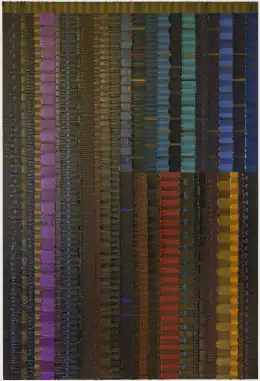 Edmonds's draped and stretched "Flag Paintings" (2018–present) were inspired by encounters with the confederate flag in the South and by U.S. electoral politics.[16][35] Her re-interpretations employ a palette derived from the spectrum of black and brown skin complexions that she accented with deep purples, greens and blues. They examine the flag as a visual statement and token of national identity relating to oppression, optimism, ownership and transformation for people of color and women.[4][43][5] Large, dark and vertically oriented to reference Black bodies, the paintings straddle abstraction and representation, with thick columns of acrylic paint suggesting textiles or strands of genetic code while only subtly revealing themselves as flag forms.[44][1][45]