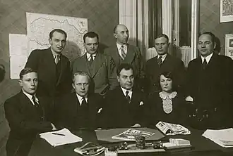 The union proposed to create a special pension fund for journalists because many of them worked as independent contractors and were not entitled to any of the state social guarantees. The union also pursued discounts for journalists, such as for public transport tickets, telephone service, theater admission.[91] Purickis particularly cared to increase international cooperation. Together with Edvardas Turauskas, director of the Lithuanian news agency ELTA, he worked to create the Baltic Press Entente between Lithuanian, Latvian, and Estonian journalists in 1931. During Purickis' tenure, the entente organized three meetings in which journalists discussed cooperation, information exchange, and coordination of political views (this was particularly important for Lithuania as Latvian press often republished anti-Lithuanian texts from Polish periodicals).[92] The Journalists' Union also searched for contacts with journalists in Finland (mostly via writer and diplomat Ignas Šeinius), Czechoslovakia (which had similar anti-Polish foreign policy due to the unresolved Polish–Czechoslovak border conflicts), Soviet Union (which was visited by a large group of Lithuanian journalists in 1934), Belgium, United States.[93] Three of Purickis' ideas – publishing a journal on journalism, establishing a disciplinary commission, and building a vacation retreat in Giruliai near Klaipėda – were completed and implemented already after his death.[94]
