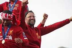 A 3–2 home victory against West Ham United on 24 February 2020 saw Klopp's side equal the English top-flight records for the most consecutive wins (18) and the most consecutive home wins (21, set by Bill Shankly's Liverpool side in the 1972–73 season); the latter setting a record for the Premier League era. Klopp said after the game that he "never thought [Manchester City's win record] would be broken or equalled."[160] A 2–1 win against Bournemouth at Anfield on 7 March saw Liverpool set an English top-flight record of 22 consecutive home wins.[161] On 25 June, Klopp's side clinched the title with 7 games left to spare; it was the club's nineteenth league title, its first since 1989–90 and its first during the Premier League era.[162] In the season, Liverpool set a number of English-top flight records including the most consecutive home wins (23), the largest point lead at the end of a matchweek (22),[163] and upon winning the league claimed the unusual achievement of winning the Premier League earlier than any other team by games played (with seven remaining) and later than any other team by date (being the only team to clinch the title in June).[164][165] Beginning the season prior, Liverpool also enjoyed a 44 match unbeaten run in the league – the second-longest streak in top-flight history – ended by Watford on 29 February.[166] Liverpool finished the season on a club record 99 points, the second-highest points tally in top-flight history; finishing 18 points clear of second place.[167][168] At the end of the season, Klopp was named LMA Manager of the Year[169] as well as Premier League Manager of the Season.[170]