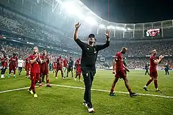 Klopp has gained notoriety for his enthusiastic touchline celebrations.[255] He received criticism in 2018 for taking things 'too far' when running on to the pitch to embrace Alisson Becker to celebrate an added time winner in the Merseyside derby.[256] Pep Guardiola spoke in defence of Klopp, saying: "I did it against Southampton. There are a lot of emotions there in those moments".[257]