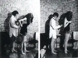 As well as Maciunas' concerts at the AG Gallery in March 1961 featuring music and events by Maciunas himself, Toshi Ichiyanagi, Mac Low and Dick Higgins,[10] the two other most important precursors to Fluxus were La Monte Young's influential series of performances in the Chambers Street loft of Yoko Ono and Toshi Ichiyanagi in 1961 involving Henry Flynt, La Monte Young, Joseph Byrd & Robert Morris amongst others; and Robert Watts and George Brecht's Yam Festival, spring 1963 at Rutgers University and New York, which included a series of mail art event scores and performances by John Cage, Allan Kaprow, Alison Knowles, Ay-O, and Dick Higgins. All of these artists and more eventually became associated with Fluxus, either through their collaboration on multiples, inclusion in anthologies, or participation in Fluxus concerts'.[2][11]