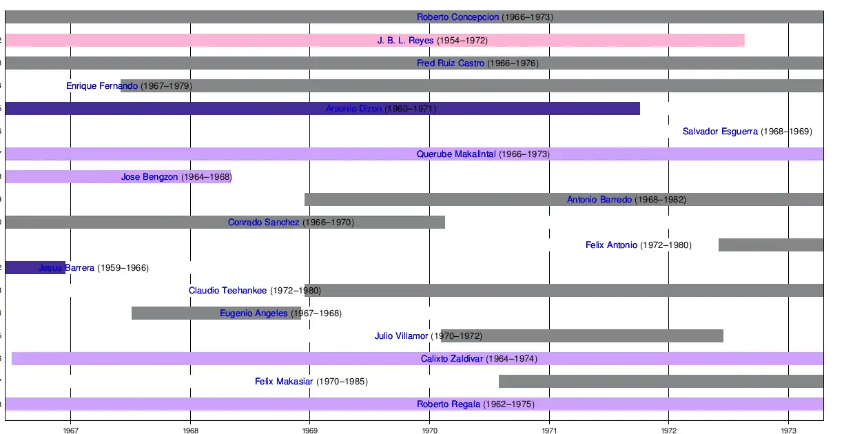 | 73 | | Roberto Regala (1897–1979) | Associate Justice | Gutierrez David | May 23, 1962 | December 22, 1975 | 13 years, 213 days | Diosdado Macapagal |