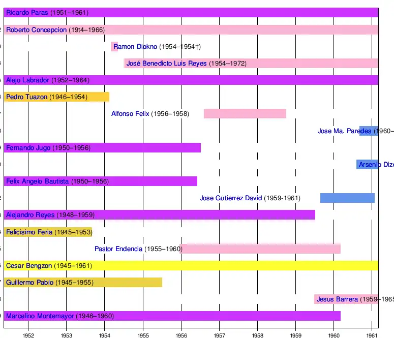 | 61 | | Alejo Labrador (1894–1967) | Associate Justice | L. Torres | April 22, 1952 | July 17, 1964 | 12 years, 86 days | |
