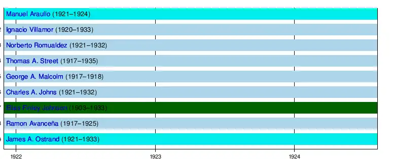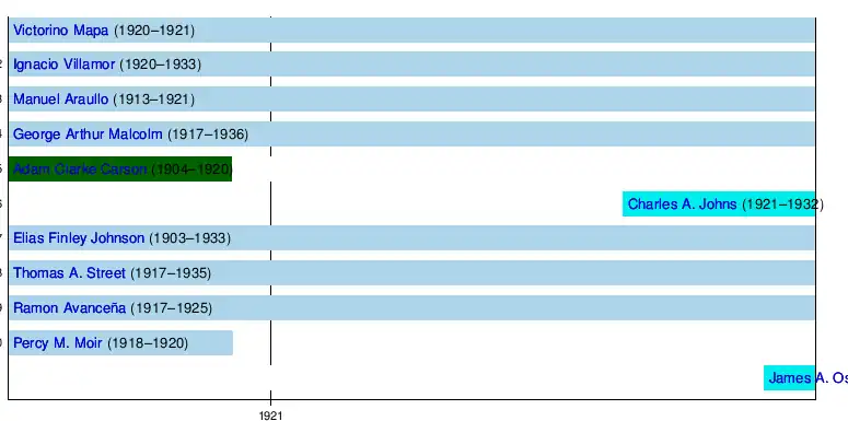| 21 | | Ignacio Villamor (1863–1933) | Associate Justice | F. Torres | May 19, 1920 | May 25, 1933[b] | 14 years, 6 days | |
