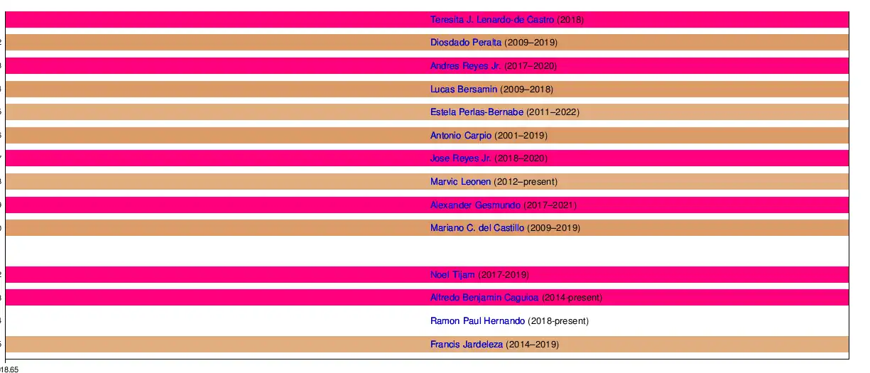 - ^ Maria Lourdes Sereno was removed as chief justice by the Supreme Court on May 11, 2018, over a quo warranto petition, making her appointment as chief justice null and void.