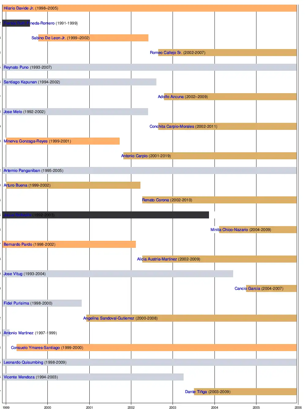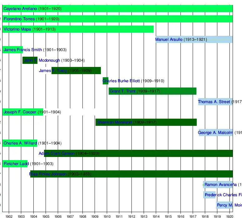 | 1 | | Cayetano Arellano (1847–1920) [1] | Chief Justice | Inaugural | June 15, 1901 | April 12, 1920 | 18 years, 302 days | William McKinley |