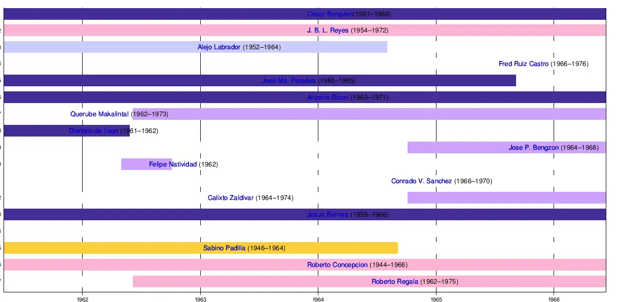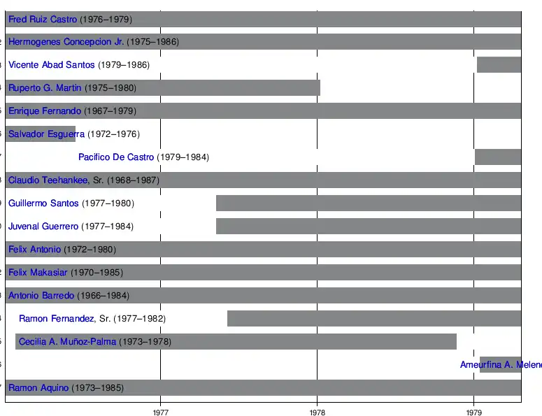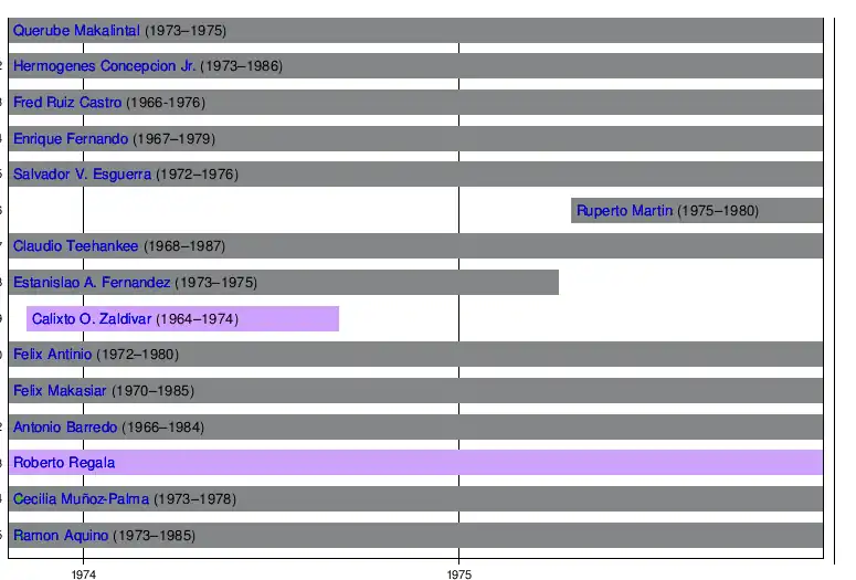 | 75 | | Calixto Zaldivar (1904–1979) | Associate Justice | Natividad | September 12, 1964 | September 13, 1974 | 10 years, 1 day | |