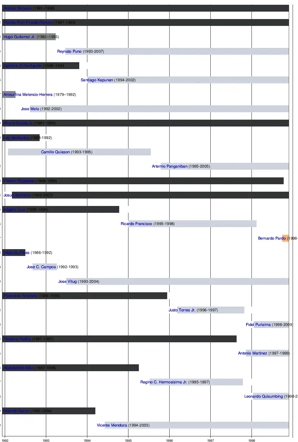 | 85 | | Felix Makasiar (1915–1992) | Associate Justice | Sanchez | August 2, 1970 | July 25, 1985 | 14 years, 357 days | |