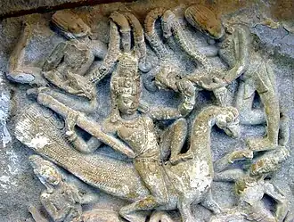 In the second myth, she is born from a spark from goddess Parvati's forehead, similar to how Muruga is born from six sparks from Shiva's forehead. From her, the devi fashions a weapon that she presents to her son as a vel. With this weapon, Muruga destroys the asura Surapadman.[3]