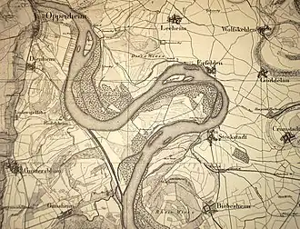 Historic map of 1829, showing the Rhine meandering before the shortcut, with the Kühkopf enclosed by the central meander, and Knoblochsaue enclosed by the northern meander | |