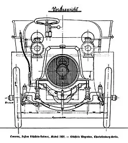 With an electric car, Kühlstein was one of only four exhibitors at the first International Motor Show Germany (IAA) in Berlin in 1897. The other three exhibitors were Gottlieb Daimler, Carl Benz and Friedrich Lutzmann. It was precisely these exhibitors who demonstrated their vehicles in front of the Hotel Bristol (Berlin) on 30 September 1887. There, the Central European Motor Car Association was founded by 160 founding members. The members came from Germany, Austria-Hungary, Switzerland, Sweden and other countries.[6] In 1898, Joseph Vollmer (1871-1955) started as chief engineer at Kühlstein Wagenbau. He designed the front axle with an engine, which could be installed in front of any horse-drawn carriage. These units were called "Avant Train" in France. Kühlstein offered these with a combustion engine or with an electric motor. Among the combustion engines, there was a two-cylinder engine with 2280 cc that produced 4 hp or a 6 hp two-cylinder engine with 3167 cc. In Berlin, in 1899, a number of taxi carriages were equipped with gasoline "Avant Train" by Kühlstein.[7] Electric motors were available in the 2.4 kW, 3 kW or 7.4 kW levels. The electric motors came from AEG. With the Avant Trains, 5t trucks could reach 16 km/h, lighter passenger carriages achieved 25 km/h.[8] The Mail-Coach of 1899 remained a one-off in postal service. The vehicle had a permissible payload of 1.26 t. This allowed the transport of up to 18 people, who could be accommodated in three three levels of seating. Two electric motors from Siemens & Halske, each with an output of 5.2 kW, were powered by a 3.2-ton battery. This battery enabled a range of 100 km. In 1899, the vehicle range consisted of gasoline-powered racing cars and touring cars in the passenger car sector. At the same time, two-seater and multi-seater electric vehicles were offered. For trucks, the program went up to 5t and buses up to 30 people were available electrically or gasoline-powered. The 5t truck had a wheelbase of 3300 mm. The total length was 5000 mm. It had a two-cylinder engine with 7125 cc with a bore of 140 mm and a stroke of 180 mm. The engine produced 10 hp. The gearbox had four gears. The maximum speeds in the gears were: 1st gear 3.5 km/h, 2nd gear 7 km/h, 3rd gear 10.5 km/h and 4th gear 14 km/h.[9] A postcarriol, which had already been rebuilt in 1899 and received gold and silver medallions in 1900 at the Paris Exhibition, was not successful for the company. The test car with the number 5 was equipped with a two-cylinder gasoline engine and reached the following speeds in the three gears: 1 gear 5 km/h, 2nd gear 10 km/h and third gear 15 km/h.[10]